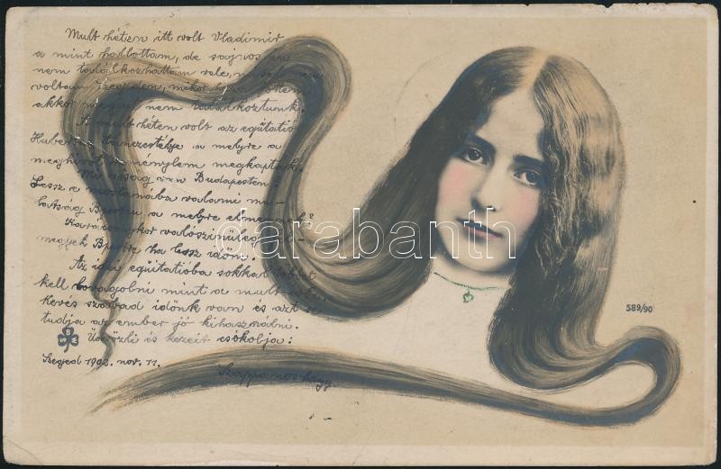 Beschreibung: 5 db háború előtti motívumlap hölgyekről és lányokról, köztük lithok