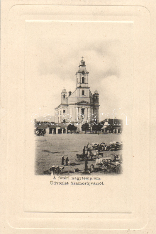 Szamosújvár Main square, Church, Emb. https://www.darabanth.com/de/168-Fernauktion/168.0/Ansichtskarten/Siebenburgen~2000257/Szamosujvar-Main-square-Church-Emb~II564148