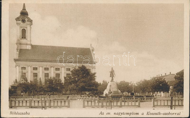 Békéscsaba Evangélikus nagytemplom, Kossuth-szobor (EK) https://www.darabanth.com/de/168-Fernauktion/168.0/Ansichtskarten/Ungarn~2000256/Bekescsaba-Evangelikus-nagytemplom-Kossuth-szobor-EK~II563110