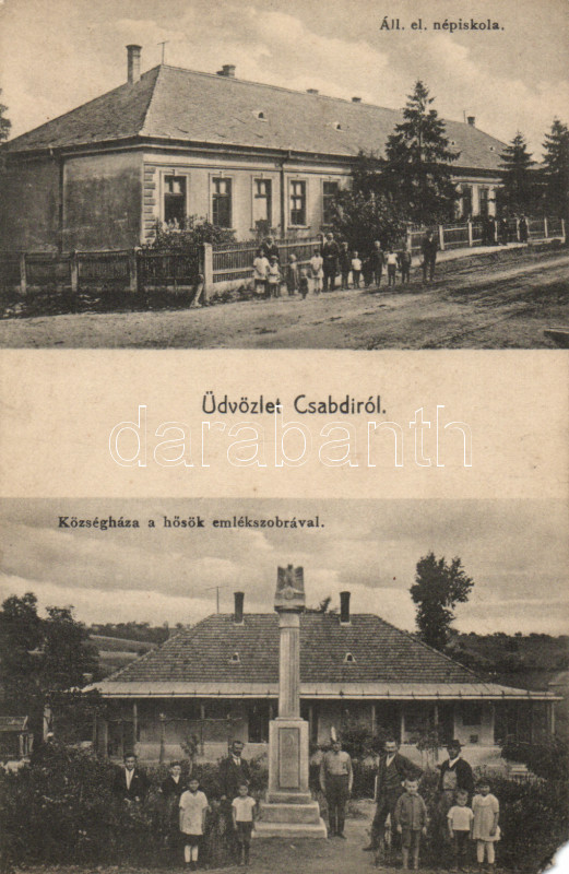 Csabdi Állami elemi népiskola, Községháza (EM) https://www.darabanth.com/de/168-Fernauktion/168.0/Ansichtskarten/Ungarn~2000256/Csabdi-Allami-elemi-nepiskola-Kozseghaza-EM~II563578