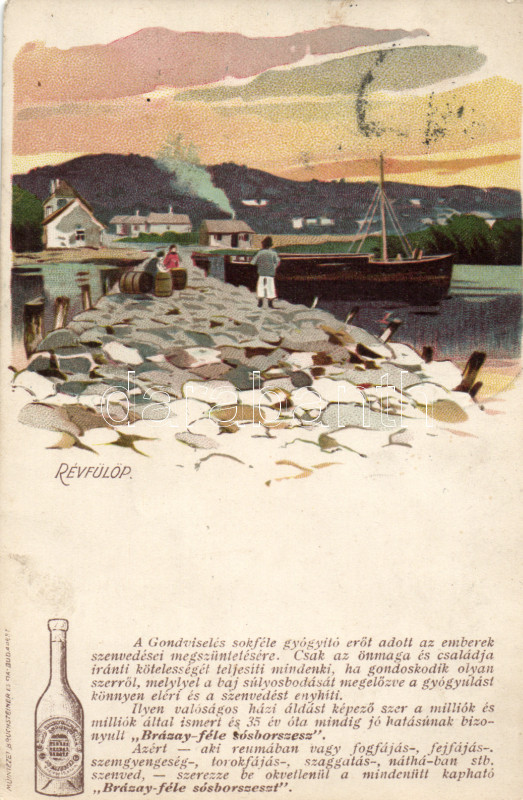 Révfülöp Brázay-féle sósborszesz reklám, litho https://www.darabanth.com/de/168-Fernauktion/168.0/Ansichtskarten/Ungarn~2000256/Revfulop-Brazay-fele-sosborszesz-reklam-litho~II563450