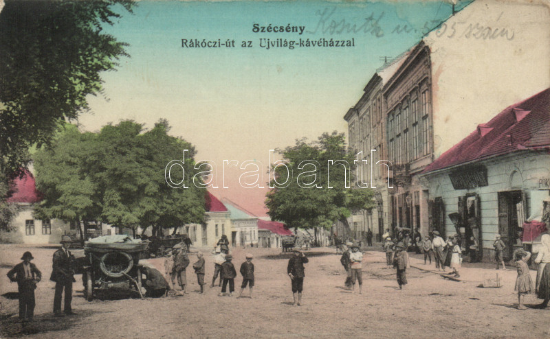 Szécsény Rákóczi út, Újvilág kávéház, üzletek (small tear) https://www.darabanth.com/de/168-Fernauktion/168.0/Ansichtskarten/Ungarn~2000256/Szecseny-Rakoczi-ut-Ujvilag-kavehaz-uzletek-small-tear~II563540