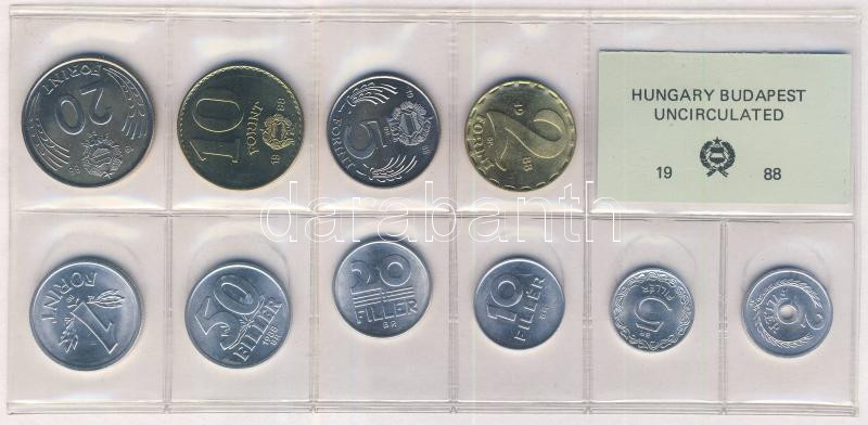 1988. 2f-20Ft 10db klf érmés forgalmi sor fóliatokban T:1 https://www.darabanth.com/de/168-Fernauktion/168.0/Numismatik/Ungarische-Munzen~2000354/1988-2f-20Ft-10db-klf-ermes-forgalmi-sor-foliatokban-T1~II565964
