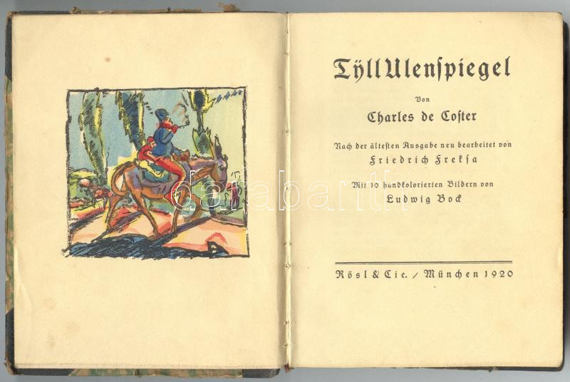 De Coster, Charles: Tyl Ulenspiegl - Mit 10 handkolorierten Bildern von Ludwig Bock. München 1920. Kösl & Klie. Kézzel színezett rajzokkal kis hibás félbőr kötésben / slightly damaged half-leather binding