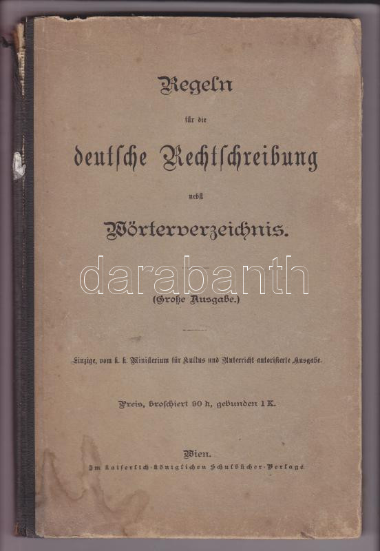 Regeln für die deutsche Rechtschreibung nebst Wörterverzeichnis. Wien, 1902, Kaiserlich-königlichen Schulbücher-Verlag. Félvászon kötésben, kissé kopottas állapotban /