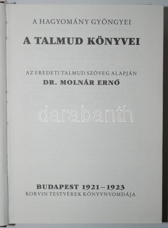 A Talmud könyvei. Az eredeti Talmud szöveg alapján dr. Molnár Ernő. Bp... https://www.darabanth.com/de/169-Fernauktion/169.0/Andere-Sammelgebiete/Bucher-Judaica~4000035/A-Talmud-konyvei-Az-eredeti-Talmud-szoveg-alapjan-dr-Molnar-Erno-Bp-1989-IKVA-KonyvkiadC3~II571134