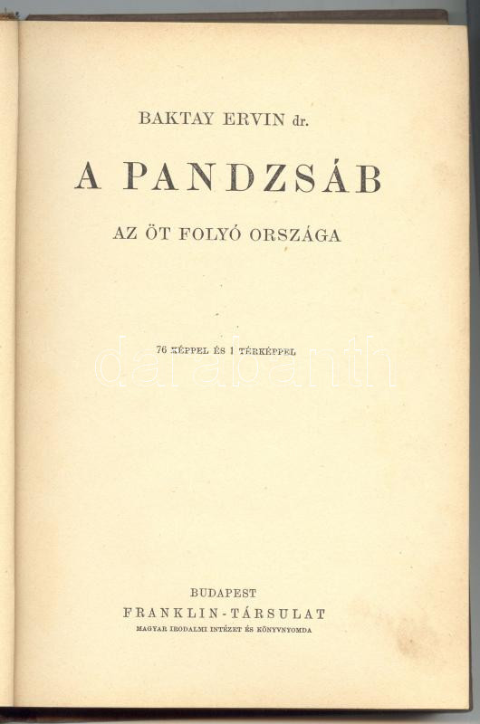 Magyar Földrajzi Társaság Könyvtára: Baktay Ervin Pandzsáb. Bp., Franklin. aranyozott kiadói egészvászon kötésben