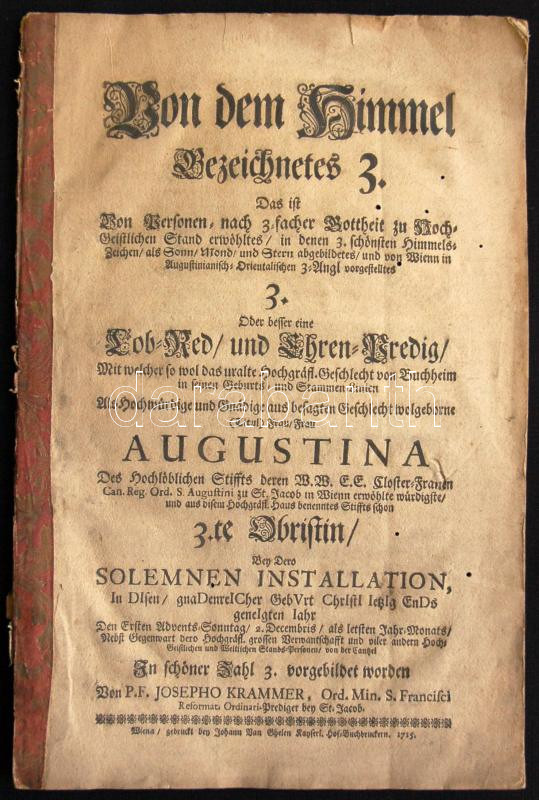 Josepho Kramer: Von dem Himmel Gezeichnetes 3. Lob-Red und Ehren-Predi... https://www.darabanth.com/de/169-Fernauktion/169.0/Andere-Sammelgebiete/Bucher-Religion~4000034/Josepho-Kramer-Von-dem-Himmel-Gezeichnetes-3-Lob-Red-und-Ehren-Predig-Frau-Augustina-Wiena-1~II497370