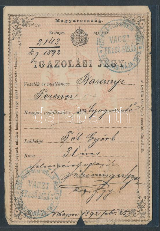 1891 Igazolási jegy vályogvető részére / ID https://www.darabanth.com/de/169-Fernauktion/169.0/Andere-Sammelgebiete/Dokument~4000014/1891-Igazolasi-jegy-valyogveto-reszere-ID~II519716