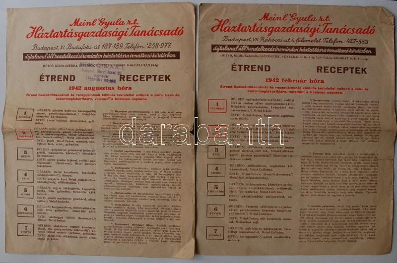 1942 Meinl Gyula Rt. Háztartásgazdasági Tanácsadó: Étrend receptek feb... https://www.darabanth.com/de/169-Fernauktion/169.0/Andere-Sammelgebiete/Drucksachen~4000025/1942-Meinl-Gyula-Rt-Haztartasgazdasagi-Tanacsado-Etrend-receptek-februar-es-augusztus-hor~II511927