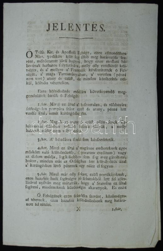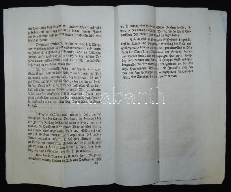 1793 Császári rendelet a magánkézben lévő nemesfémek hadi célú kölcsönzésére, és pénzzé veretésére a franciák elleni háború céljára. Magyar, latin és német nyelven. /