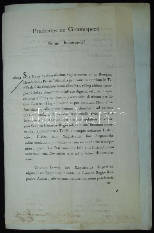 1829 Birodalmi vámrendeletet kihirdető helytartótanácsi levél gróf Pálffy Fidél, tárnokmester, főkancellár és gróf Zichy László tanácsos saját kezű aláírásaival / Letter of the GOverning Council with order of costums, signed with autograph signatures 18 + 2 p.