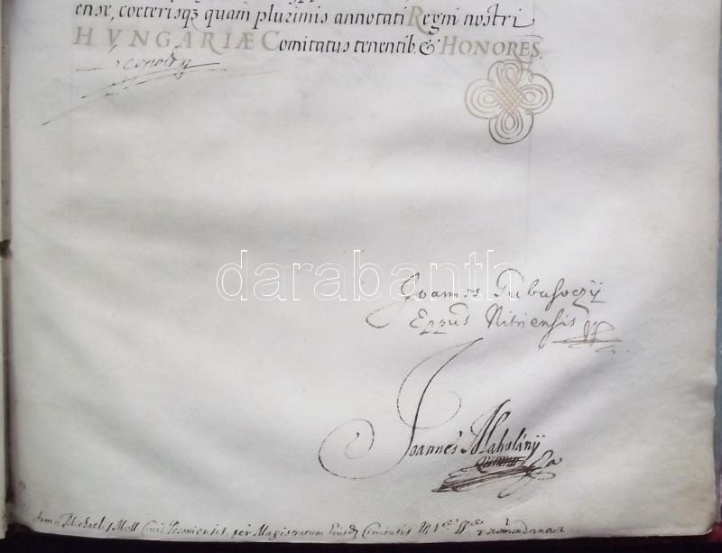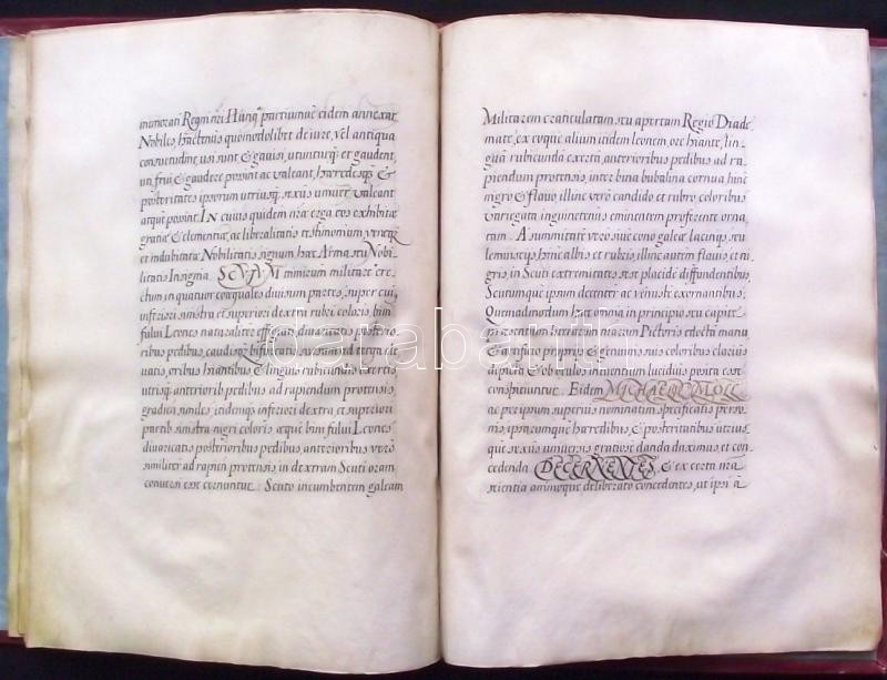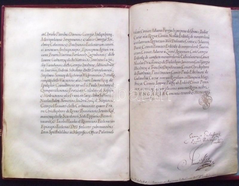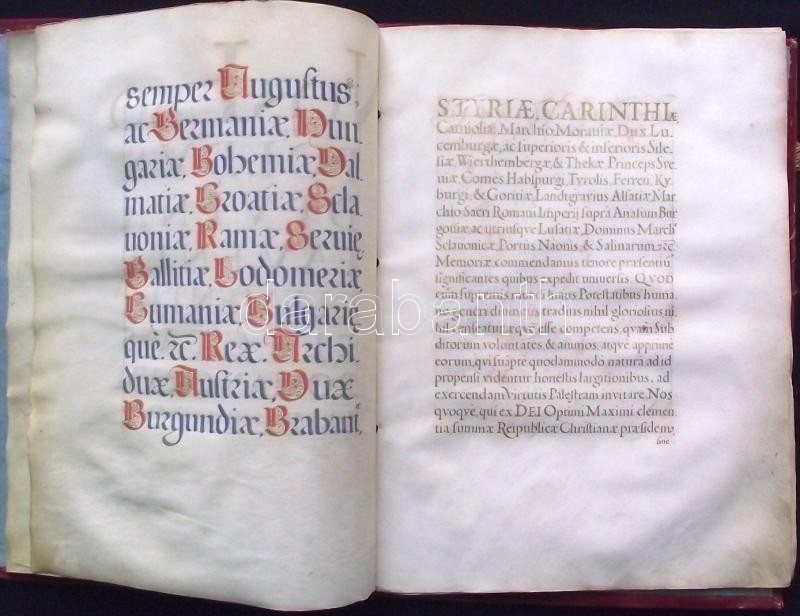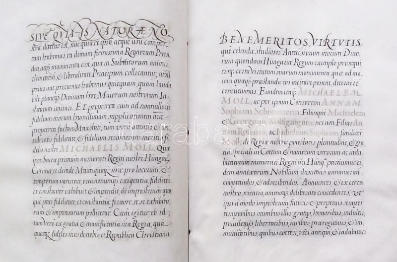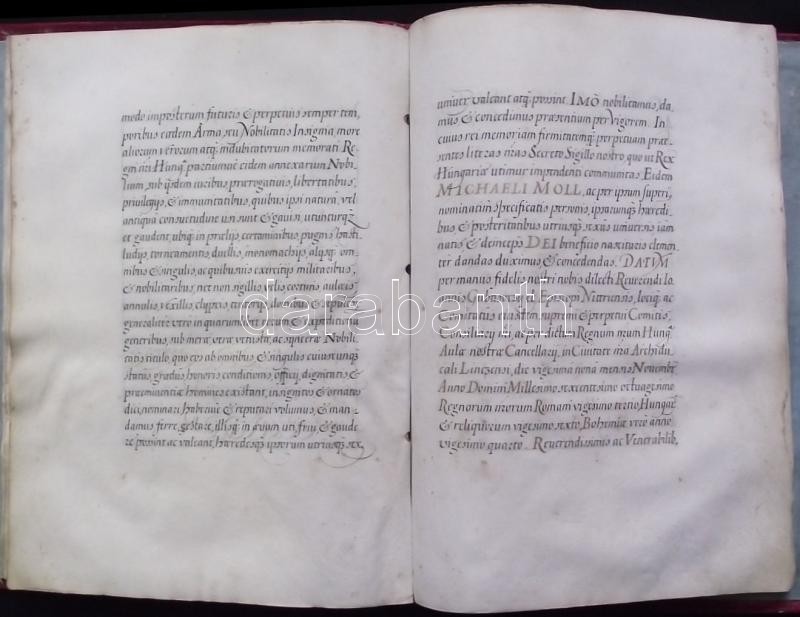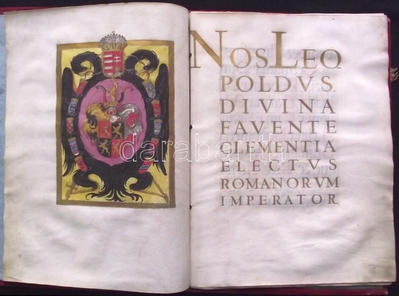 VÉDETT! 1680 I. Lipót császár által kiadott armalis (címeres-levél) Moll (Mohl) Mihály és családja részére. 12 beírt pergamen oldal, egy címerkép, bordó bársony kötésben, hiányzó összekötő szalagokkal. Az oklevélen I Lipót császár, Gubasóczy János kancellár, nyitrai püspök és Maholány János királyi személynök saját kezű aláírásaival. Kihirdetve Pozsonyban 1681-ben és Kassán 1831-ben. Jó állapotban. / PROTECTED by the Hungarian Ministry of Cultural Heritage. Armalis (enobling letter) for Michaelis Moll (Mohl). With aotograph signature of Emperor Leopold I. and chancelor and bishop of Nitra Gubasóczy János. Announced in Bratislava in 1681 and in Kosice in 1831. 12 pages on pergamin and hand drawn coat of arms. In velvet binding. Nice condition. 26x35 cm