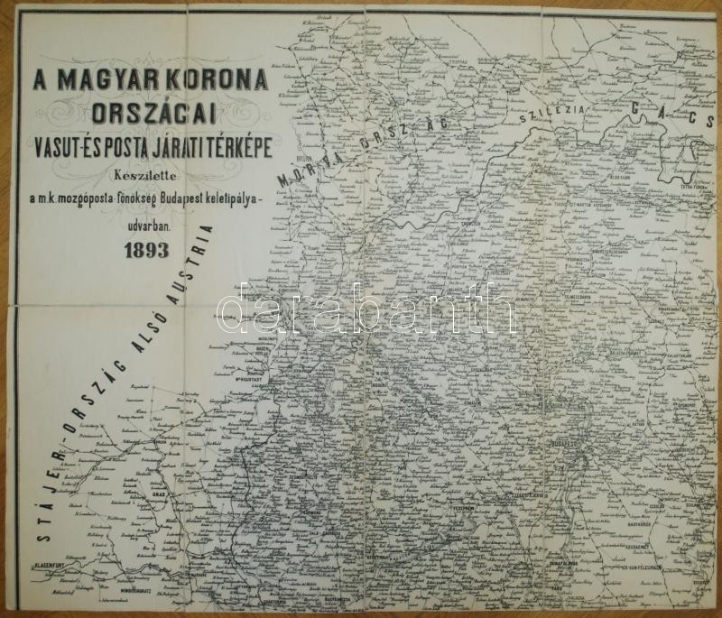1893 A Magyar Koronai Országainak vasút és postajárati térképe. Készítette a m. k. mozgóposta-főnökség Budapest Keleti pályaudvarában. Vászonra kasírozva. Jó állapotban. / Kingdom Hungary railways and post-railways map with the neighbouring countries. Canvas. 130x110 cm