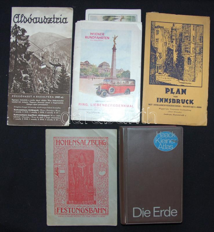 Kis térkép- és prospektustétel: Die Erde zsebatlasz, valamint 4db háború előtti prospektus térképekkel és reklámokkal Bécsről, Innsbruckról, Hohensalzburgról, illetve Alsó-Ausztriáról