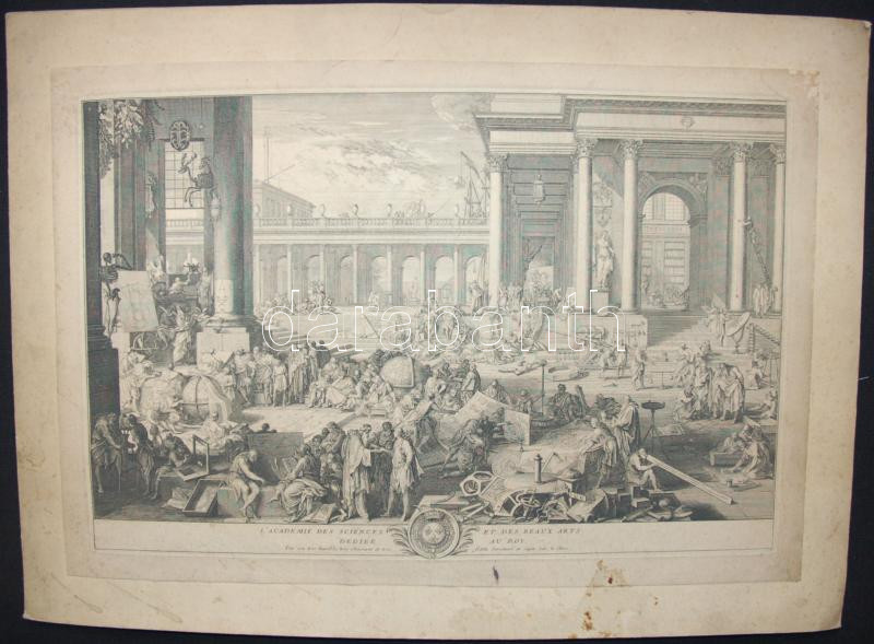 Beschreibung: Sébastien Leclerc (1637-1714): L'Académie des sciences et des beaux-arts dédiée au Roy, rézkarc, kartonra kasírozva /