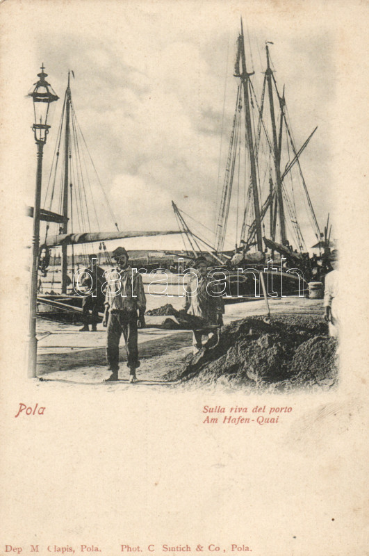 Pola ship station, dock workers https://www.darabanth.com/de/169-Fernauktion/169.0/Ansichtskarten/Kroatien~500009/Pola-ship-station-dock-workers~II568284