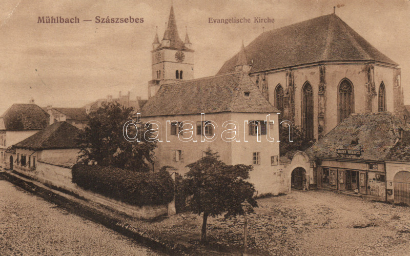 Szászsebes Evangelist church, Shop of Josef Hientz (EK) https://www.darabanth.com/de/169-Fernauktion/169.0/Ansichtskarten/Siebenburgen~500006/Szaszsebes-Evangelist-church-Shop-of-Josef-Hientz-EK~II568593