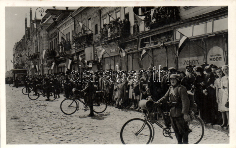 Szatmárnémeti entry of the Hungarian troops, cyclist unit So.Stpl https://www.darabanth.com/de/169-Fernauktion/169.0/Ansichtskarten/Siebenburgen~500006/Szatmarnemeti-entry-of-the-Hungarian-troops-cyclist-unit-SoStpl~II567603