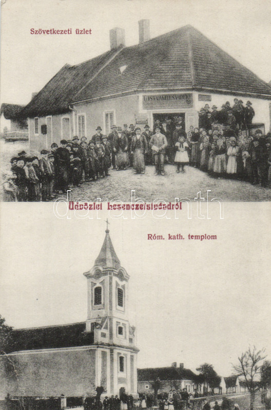 Beschreibung: Lesenceistvánd Szövetkezeti üzlet, Római katolikus templom (small tear)