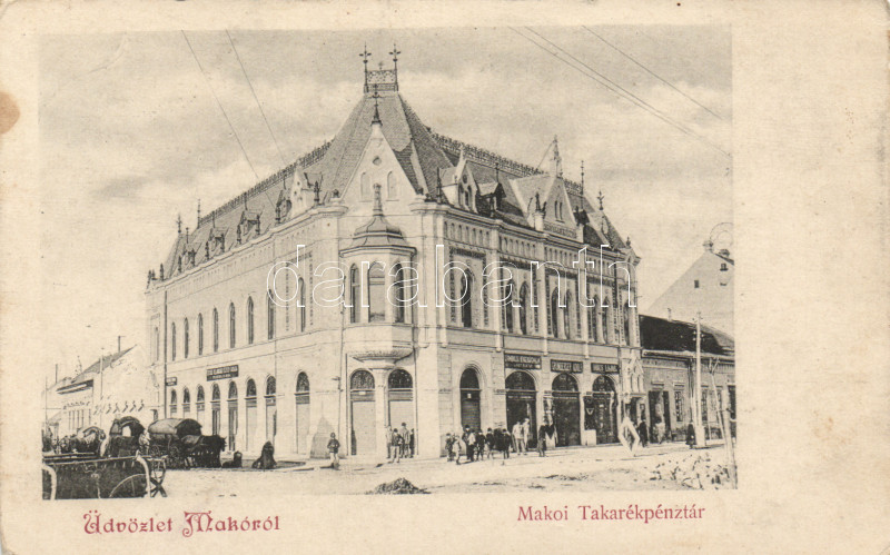 Makó Takarékpénztár, Grünberg Adolf és Hoics Lajos üzletei https://www.darabanth.com/de/169-Fernauktion/169.0/Ansichtskarten/Ungarn~500005/Mako-Takarekpenztar-Grunberg-Adolf-es-Hoics-Lajos-uzletei~II569231