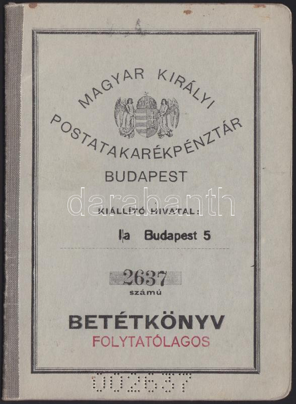 cca 1942. A Magyar Királyi Postatakarékpénztár betétkönyve; Budapest https://www.darabanth.com/de/169-Fernauktion/169.0/Numismatik/Numismatische-Dokumente-und-Briefe~4000123/cca-1942-A-Magyar-Kiralyi-Postatakarekpenztar-betetkonyve-Budapest~II432552