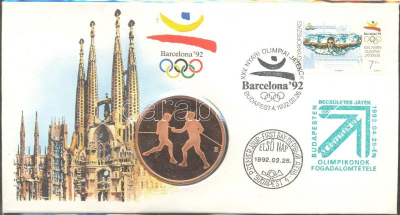 Beschreibung: 1992. "Barcelona-magyar csapat" emlékérem bélyeges borítékon, elsőnapi bélyegzéssel T:PP Csak 10000db!