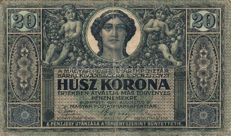 1919. augusztus 9. 20K T:III- https://www.darabanth.com/de/169-Fernauktion/169.0/Numismatik/Ungarische-Banknoten~4000128/1919-augusztus-9-20K-TIII-~II502927