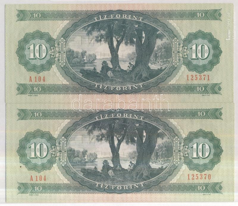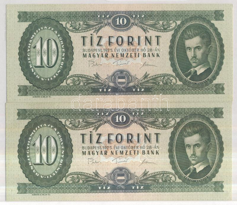 1975. 10Ft (2x) egymást követő sorszámmal! T:I https://www.darabanth.com/de/169-Fernauktion/169.0/Numismatik/Ungarische-Banknoten~4000128/1975-10Ft-2x-egymast-koveto-sorszammal-TI~II569682