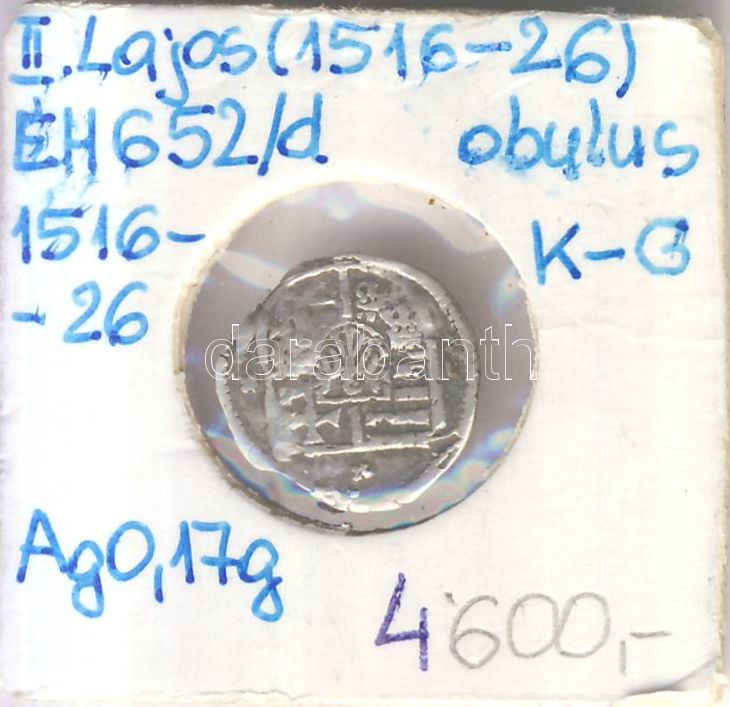 Huszár 819.,Ung... https://www.darabanth.com/de/169-Fernauktion/169.0/Numismatik/Ungarische-Munzen~4000129/1516-1526-Obulus-Ag-II-Lajos-0-17g-T2--3Cbr3EHuszar-819-Unger-I-652d~II569616