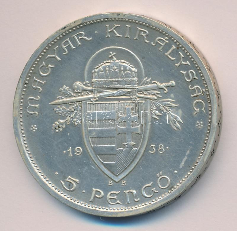 1938. 5P Ag "Szent István" T:2 https://www.darabanth.com/de/169-Fernauktion/169.0/Numismatik/Ungarische-Munzen~4000129/1938-5P-Ag-Szent-Istvan-T2~II566678