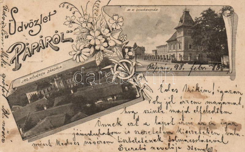 1898 Pápa, Irgalmas nővérek zárdája, dohánygyár, floral (fl) https://www.darabanth.com/de/17-Gross-Auktion/17.1/Ansichtskarten-Ungarn/Ungarn~5482/1898-Papa-Irgalmas-noverek-zardaja-dohanygyar-floral-fl~II785134