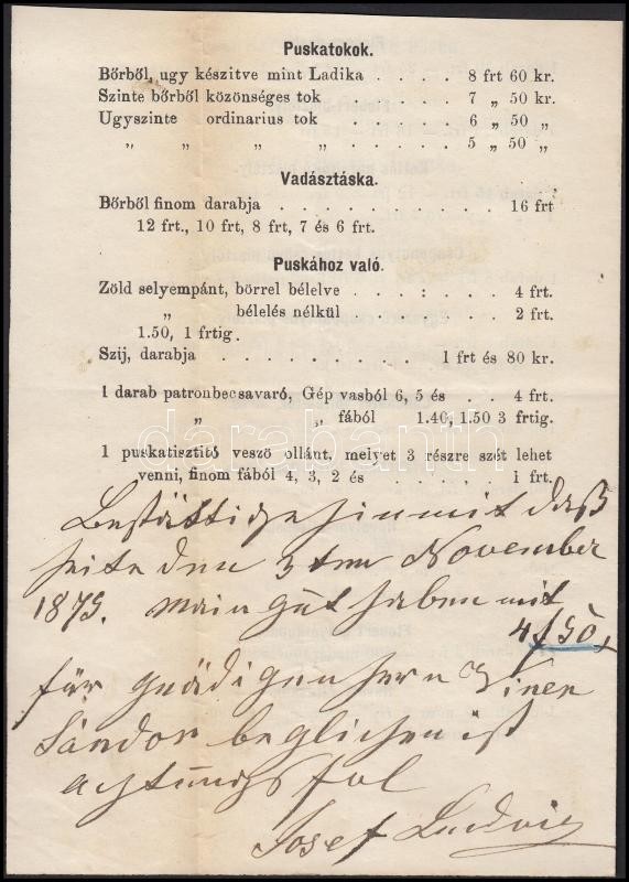 Beschreibung: 1879 Pest, Ludwig József puskaműves árjegyzéke fegyverekről és vadászati szerekről, hátoldalán kézírással, Ludwig József sajátkezű aláírásával.
