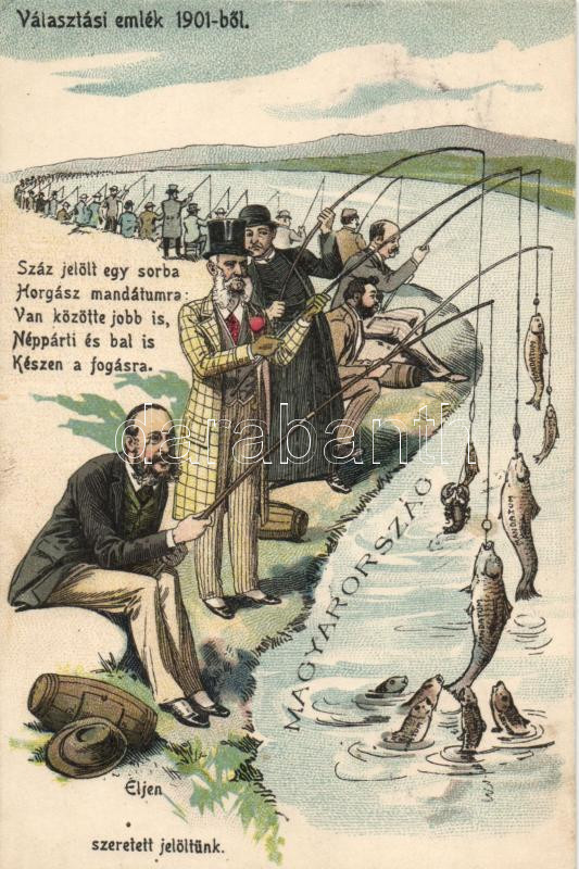 Az 1901-es választás jelöltjei mandátumot halásznak, az előtérben Szél... https://www.darabanth.com/de/17-Gross-Auktion/17.1/Thematik-und-Kunstlerkarten/Propaganda~5531/Az-1901-es-valasztas-jeloltjei-mandatumot-halasznak-az-eloterben-Szell-Kalman-Hungarian~II793273