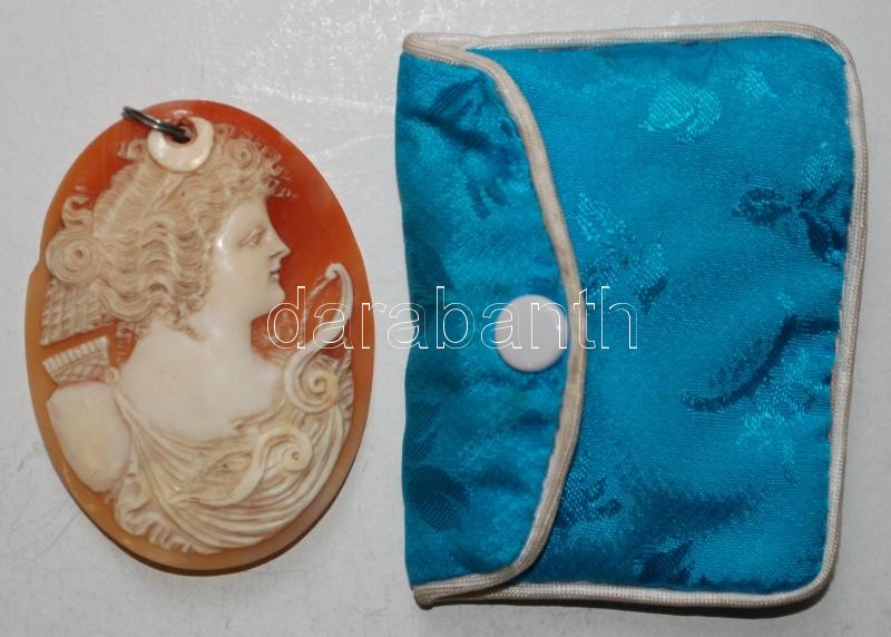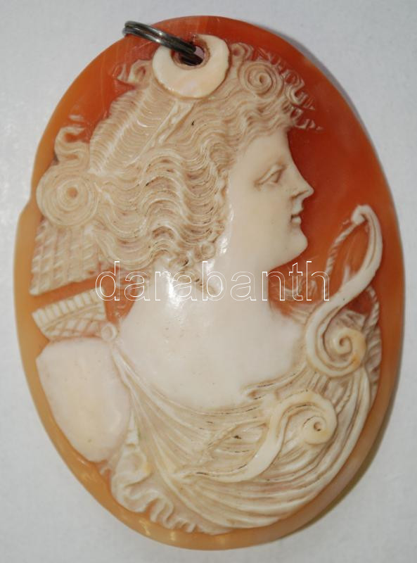 Beschreibung: Nagy ovális formájú kagyló camea, antikizáló női büszt ábrázolással, 1930 körül, súly bruttó 17 g, apró lepattanás az oldalán