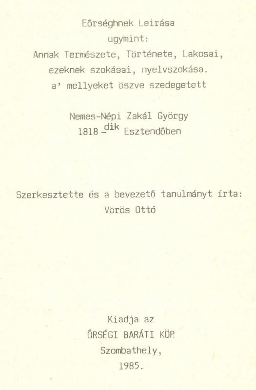 Beschreibung: Zakál György: Eörséghnek Leírása ugymint: Annak természete, története, lakosai.... Szerk.: Vörös Ottó. Szombathely 1985.