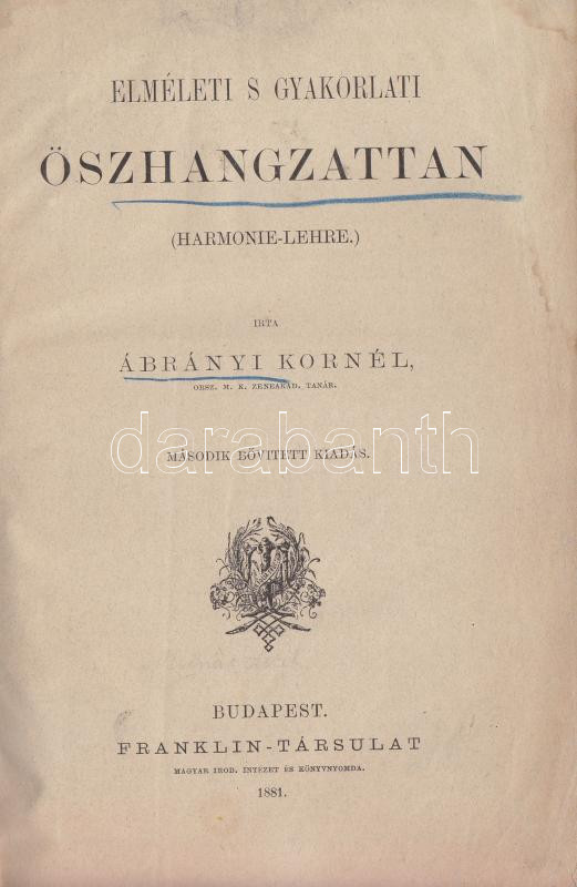 Ábrányi Kornél: Elméleti s gyakorlati összhangzattan. Bp., 1881 Frankl... https://www.darabanth.com/de/170-Fernauktion/170.0/Andere-Sammelgebiete/Bucher-Musik~500022/Abranyi-Kornel-Elmeleti-s-gyakorlati-osszhangzattan-Bp-1881-Franklin-344p-aranyozott-geri~II489377