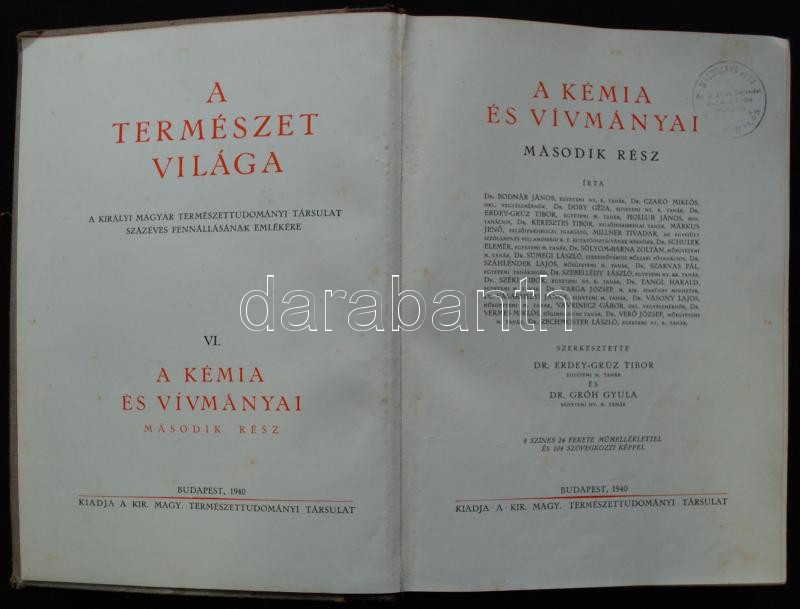 A kémia és vívmányai I-II. Szerk: Dr. Erdey-Grúz Tibor, Dr. Gróh Gyula. (A Természet Világa) Bp., 1940 Kir. Magy. Természettudományi Társulat. Színes és fekete műmellékletekkel, számos fotóval és szövegközti ábrával illusztrált, kiadói aranyozott félbőr kötésben. Az egyik kötet kötése levált, néhány lap kijár, helyenként ceruzás beírások láthatók, amúgy jó állapotú