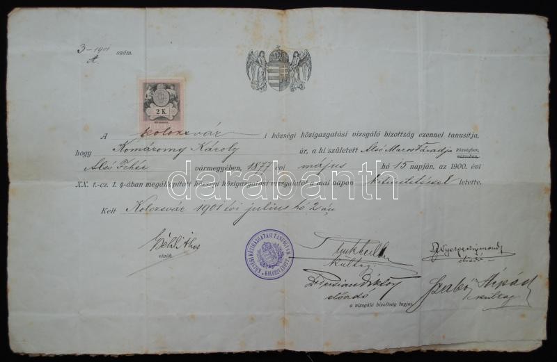 1901 Közigazgatási vizsga bizonyítvány 2K okmánybélyeggel 40x25 cm https://www.darabanth.com/de/170-Fernauktion/170.0/Andere-Sammelgebiete/Dokument~500020/1901-Kozigazgatasi-vizsga-bizonyitvany-2K-okmanybelyeggel-40x25-cm~II572477