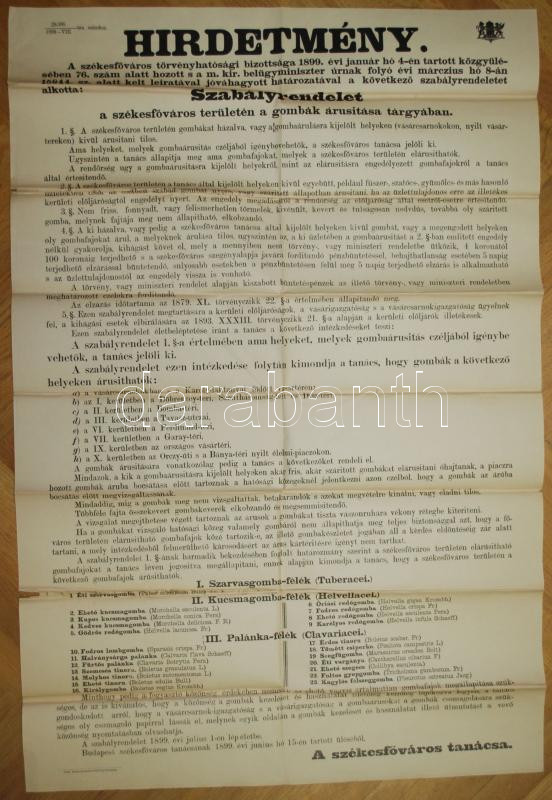 1899 Fővárosi gomba-árusításról szóló rendelet nagyméretű falragasz 70... https://www.darabanth.com/de/170-Fernauktion/170.0/Andere-Sammelgebiete/Drucksachen~500002/1899-Fovarosi-gomba-arusitasrol-szolo-rendelet-nagymeretu-falragasz-70x100-cm~II572395