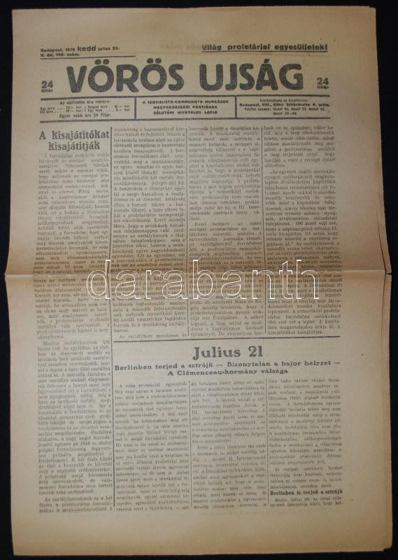 1919 A Vörös újság július 22.-i száma szép állapotban https://www.darabanth.com/de/170-Fernauktion/170.0/Andere-Sammelgebiete/Drucksachen~500002/1919-A-Voros-ujsag-julius-22-i-szama-szep-allapotban~II573367