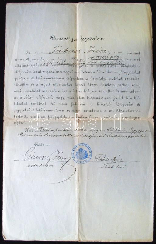 Beschreibung: 1922 Ünnepélyes fogadalom hivatalnoki eskü Tanácsköztársaság idején nyomott íven, utólag kézzel átírva