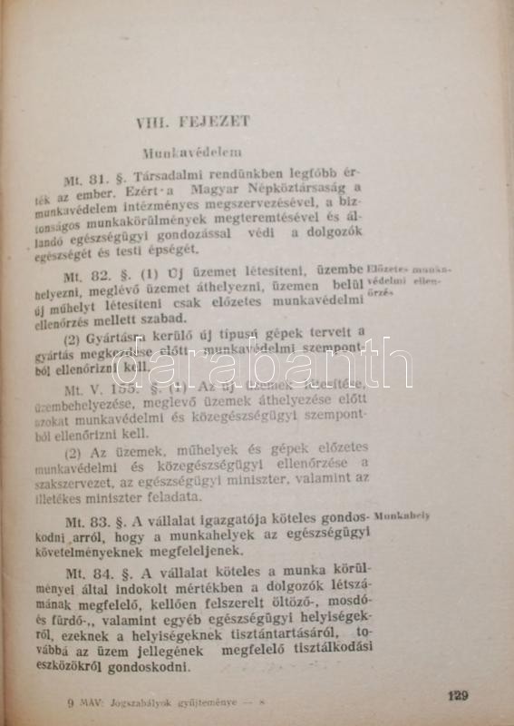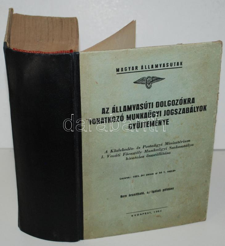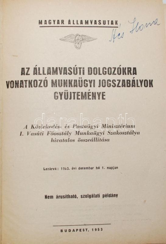 Az államvasúti dolgozókra vonatkozó munkaügyi jogszabályok gyüjteménye. Nem árusítható, szolgálati példány. Bp., 1953, Magyar Államvasutak. Kopottas félvászon kötésben