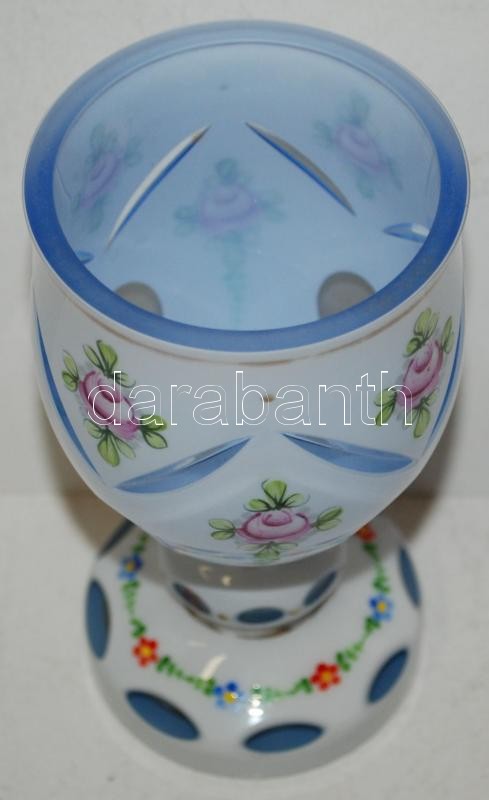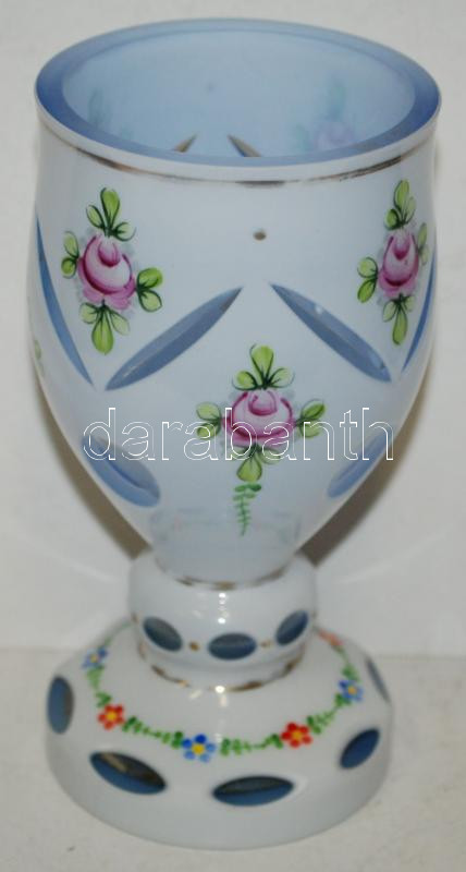 Beschreibung: Fehér üveg kézzel festett díszpohár, több rétegű, csiszolt, metszett, hibátlan, m:16 cm