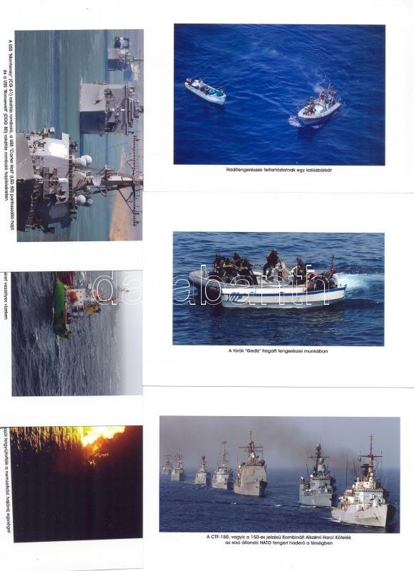 Beschreibung: 13db nyomtatott színes digitális fotó a szomáliai kalózokról, amerikai, NATO- és török katonai alakulatokról, katonai hajókról és egyéb járművekről, 14x10cm