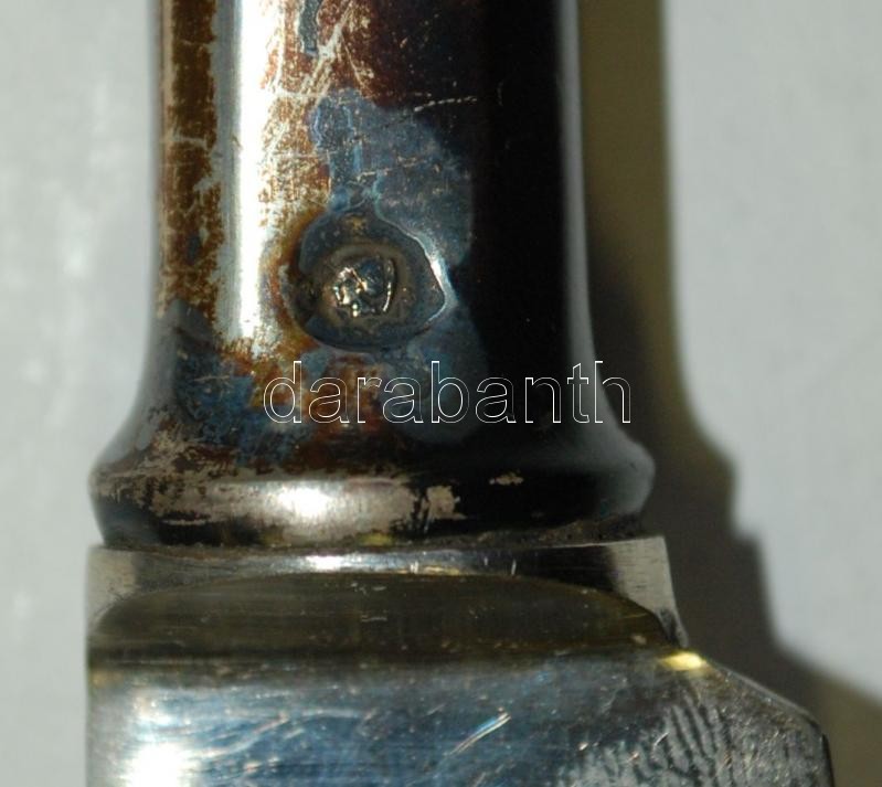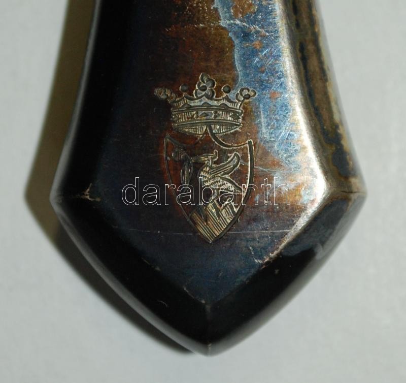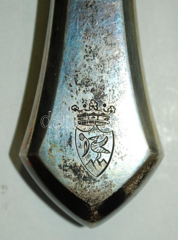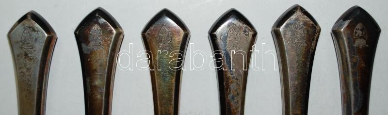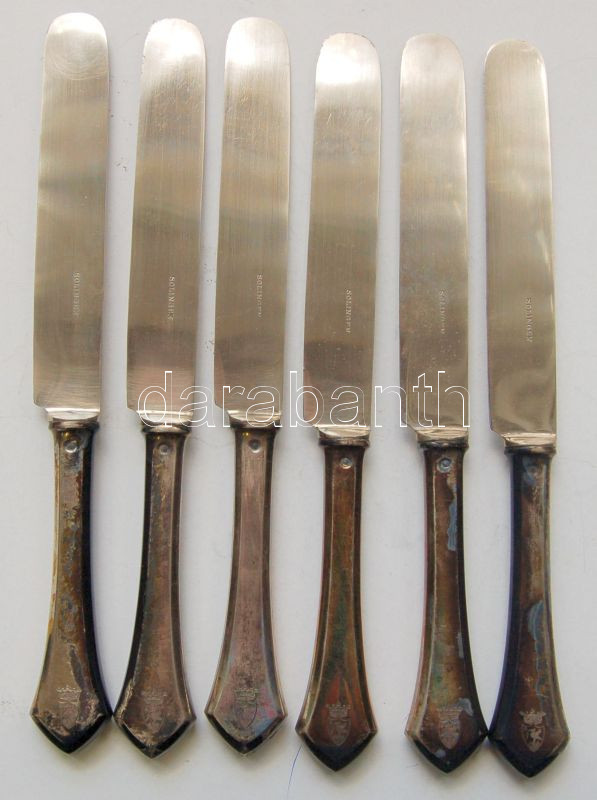1921-1928 6db-os késkészlet Solingeni acélból, 800/1000 tisztaságú csehszlovák jelzéssel ellátott ezüst (Ag) nyéllel, FB mesterjellel és a Trencsén vármegyei Nemák család nemesi címerével /