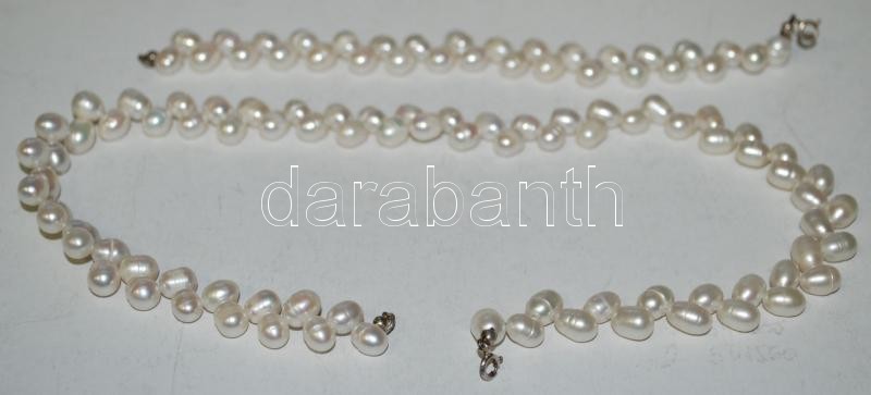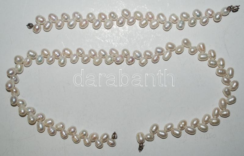 Tenyésztettgyöngy-nyaklánc ferdén fúrt szemekkel, hozzá tartozó karlánccal, mindkettő ezüst (Ag) szerelékkel /