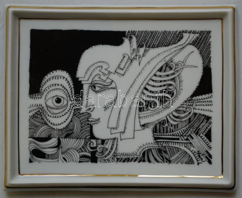 Beschreibung: 1979 Kézzel aranyozott hollóházi porcelán kép Szász Endre szignált Arcok sorozatból, hibátlan, 12×15 cm