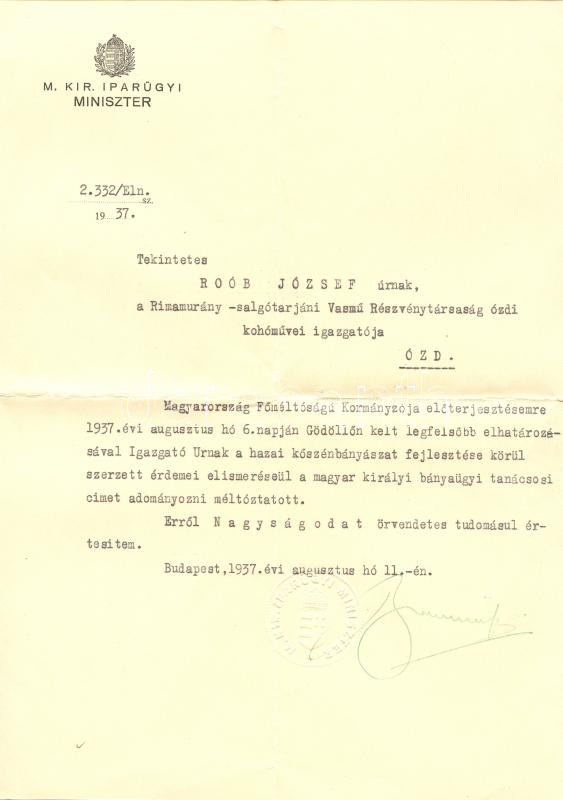 Beschreibung: 1937 királyi bányaügyi tanácsosi kinevezés Bornemisza Géza iparügyi miniszter saját kezű aláírásával