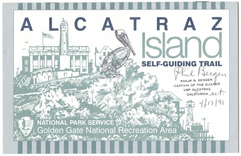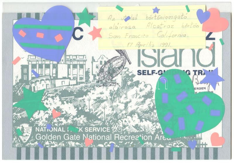 Beschreibung: 1991 Az Alcatraz utolsó börtönigazgatója által aláírt nyomtatvány / Autograph signed by the last captain of the guards of Alcatraz